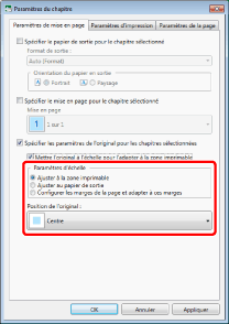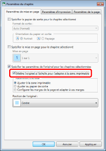 Configurez ce paramètre si l'option [Ajuster à la zone imprimable]/[Configurer les marges de la page et adapter à ces marges] est sélectionnée dans [Paramètres d'échelle].