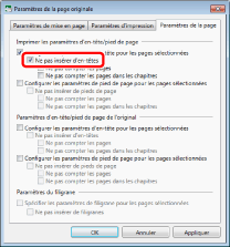 Pour annuler le pied de page de la page à imprimer, cochez les cases [Configurer les paramètres de pied de page pour les pages sélectionnées] et [Ne pas insérer de pieds de page].