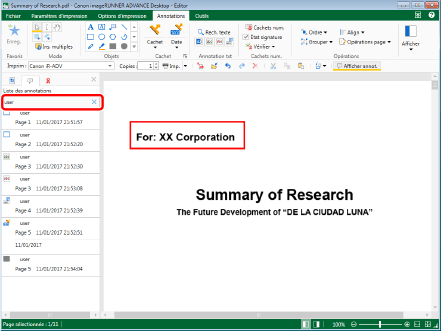 Lors de la sélection d'annotations dans l'onglet [Liste des annotations], ces mêmes annotations sont sélectionnées dans la Fenêtre de travail. Cependant, en cas de sélection d'une annotation figurant sur une page autre que la page courante, la page contenant l'annotation sélectionnée s'affiche automatiquement dans la Fenêtre de travail.