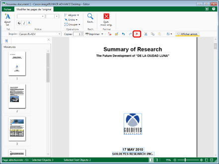 Si l'utilisateur sélectionne un objet dans la Fenêtre de travail, le nombre total d'objets sélectionnés et le nombre d'objets texte s'affichent sur la barre d'état.
