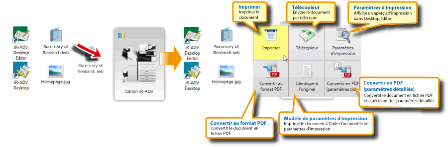 Quick Printing Tool est capable de surveiller l'état et les tâches d'impression/télécopie de périphériques tels que les périphériques imageRUNNER ADVANCE et de gérer le journal d'impression/de télécopie, de la même manière que Printer Monitor. Il peut également afficher des icônes pour l'état du périphérique et des tâches et avertir les utilisateurs de la réception d'une télécopie au moyen d'un signal sonore.