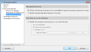 Cochez cette case pour afficher la [Liste des documents non lus/modifiés] lorsque de nouveaux documents sont présents dans Mon bac.