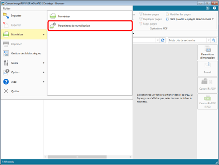 Sélectionnez le menu [Fichier] > [Numériser] > [Paramètres de numérisation].
