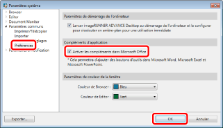 Cliquez sur [Paramètres communs] > cochez la case [Activer les compléments dans Microsoft Office] dans [Préférences], et cliquez sur [OK].