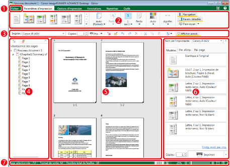 Si l'onglet [Paramètres d'impression]/[Options d'impression] est sélectionné dans le rubanOnglet [Arborescence des pages] : affiche l'arborescence des pages du document. Il est possible de développer ou de réduire les chapitres affichés dans la liste.