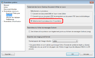 Vous pouvez sélectionner le processus Canon Desktop Document Writer dans les paramètres [Importer] des paramètres système. La boîte de dialogue de sélection du processus ne s'affiche que si [Sélectionner le processus lors l'importation] est sélectionné.
