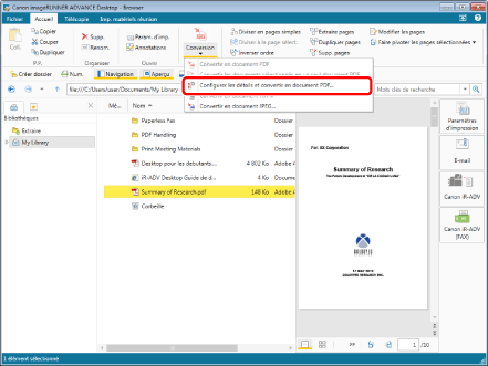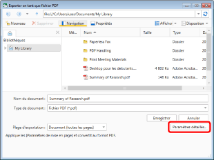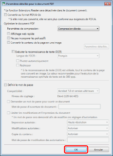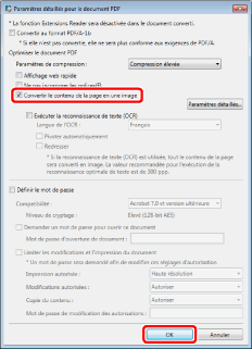 Si vous sélectionnez [Configurer les détails et convertir en document PDF], [Paramètres détaillés pour le document PDF] s'affiche.