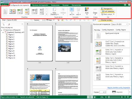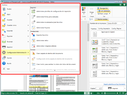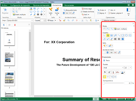 La cinta incluye pestañas de comandos para realizar operaciones, como configurar los ajustes de impresión, añadir anotaciones o sellos digitales, y activar el Modo de ajuste de impresión de Combinación de correspondencia/varios modos de edición.
