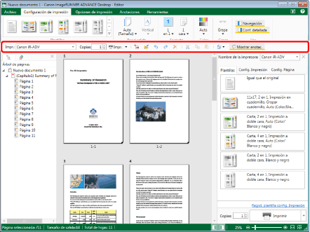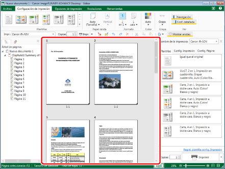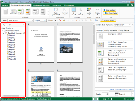Pestaña [Árbol de páginas]: muestra el árbol de páginas del documento. Puede expandir y contraer los capítulos mostrados en la pestaña.