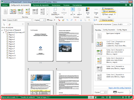 La barra de estado muestra el número total de páginas del documento, el número de página de la página seleccionada en ese momento, los tamaños del papel de salida y el número de hojas a imprimir. También le permite realizar las siguientes operaciones.