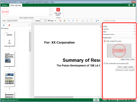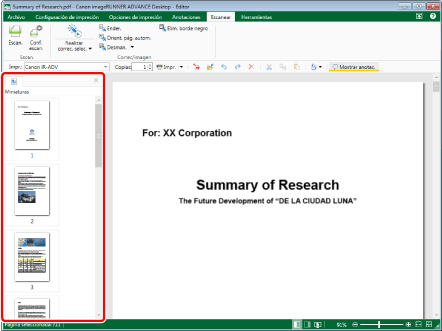 Pestaña [Miniaturas]: muestra las miniaturas de las páginas del documento. Al hacer clic en las miniaturas, puede seleccionar las páginas que va a mostrar o editar.