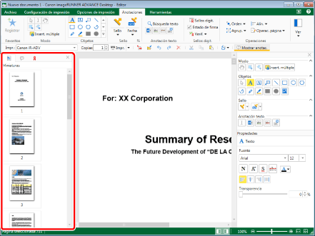 Pestaña [Miniaturas]: muestra las miniaturas de la página del documento. Podrá seleccionar las páginas que desea visualizar o editar haciendo clic en las miniaturas de página.