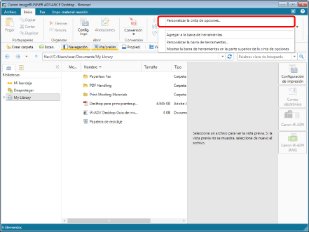 Haga clic con el botón derecho del ratón en la cinta o la barra de herramientas y seleccione [Personalizar la cinta de opciones].