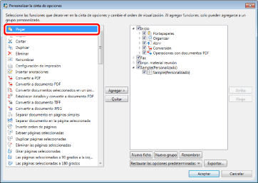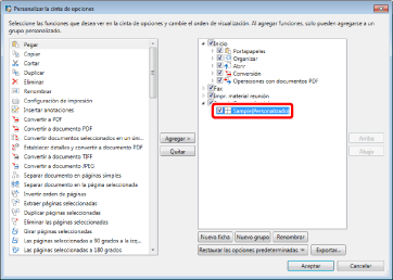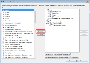 Para cambiar el orden de visualización de las pestañas, los grupos y los comandos añadidos, seleccione la pestaña, el grupo o el comando del que quiera cambiar el orden de visualización en la lista de la derecha y haga clic en [Arriba]/[Abajo].