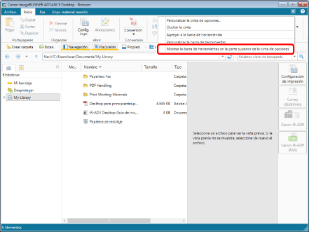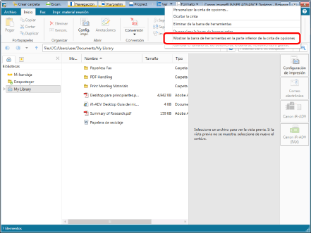 En esta sección se describe cómo mostrar la barra de herramientas por debajo de la cinta mediante el menú que aparece al hacer clic con el botón derecho del ratón.