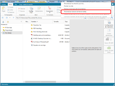 Haga clic con el botón derecho del ratón en la cinta o la barra de herramientas y seleccione [Personalizar la barra de herramientas].