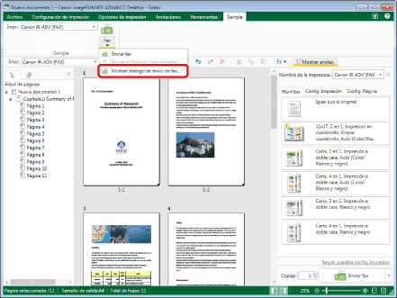 A continuación encontrará más información sobre cómo enviar documentos por fax desde Desktop Editor sin configurar las opciones detalladas mediante un cuadro de diálogo.