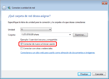 Para Windows 8.1/Windows 10, seleccione la casilla de verificación [Conectar de nuevo al iniciar sesión].