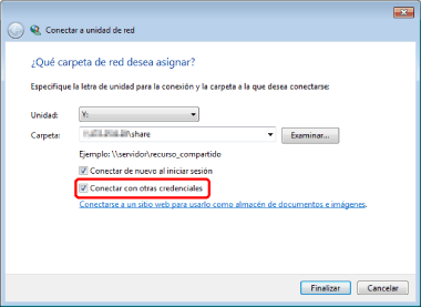 Si se necesita un nombre de usuario y contraseña para abrir la carpeta compartida, seleccione la casilla de verificación de [Conectar con otras credenciales].