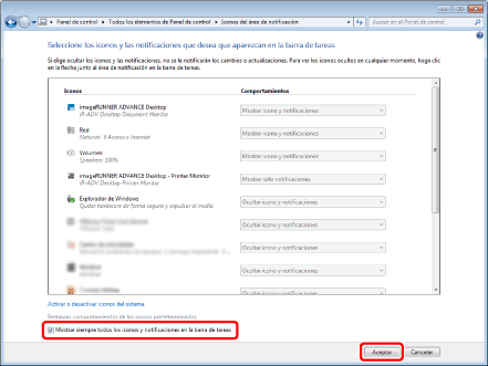 Seleccione la casilla de verificación [Mostrar siempre todos los iconos y notificaciones en la barra de tareas], y haga clic en [Aceptar].