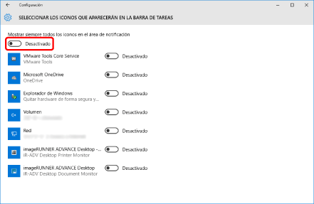 Haga clic en [Desactivado] para [Mostrar siempre todos los iconos en el área de notificación].