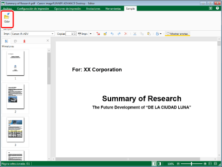 Si cambia a la pestaña [Configuración de impresión] o la pestaña [Opciones de impresión] de la cinta, al sobrescribir aparece un mensaje de confirmación. Para sobrescribir el documento PDF, haga clic en [Sí].