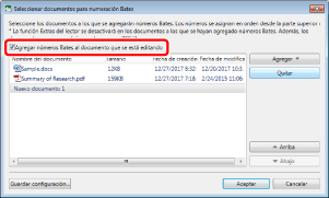Al convertir varios documentos en un documento PDF, se añadirá un número Bates a los documentos desde el documento que aparece al comienzo de la lista.