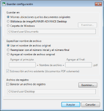 Si se selecciona [Mismas ubicaciones que los documentos originales] en [Guardar en], el documento PDF se guardará en [Mis documentos]/[Documento] en el ordenador.