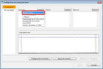 Se pueden configurar para el encabezado o pie de página tanto una cadena personalizada como los elementos que se muestran en la lista desplegable que aparece al hacer clic en [Insertar]. Para configurar una cadena personalizada, introduzca la cadena en el cuadro de texto en la posición en la que se insertará.