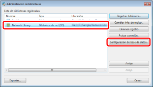 Las Bibliotecas de red (bases de datos) se mostrarán como "Biblioteca de red (BD)" en el campo [Tipo] de la [Administración de bibliotecas].
