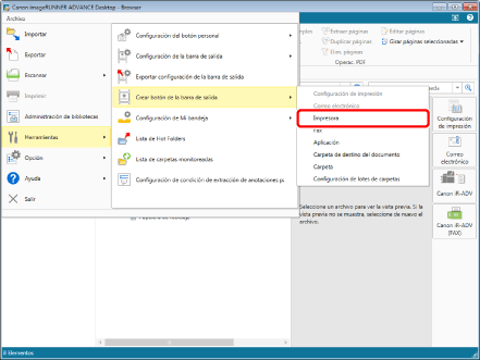 Dependiendo del tipo de impresora (por ejemplo, una impresora de red), es posible que no pueda registrar el botón de salida de impresora mediante la función de arrastrar y soltar. En este caso, registre el botón de salida de [Impresora] mediante la configuración avanzada. A continuación encontrará más información sobre cómo configurar las opciones avanzadas.