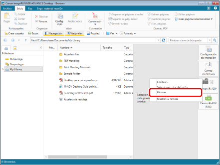 O bien seleccione el menú [Archivo] > [Herramientas] > [Configuración de la barra de salida] > (nombre de impresora) > [Eliminar].