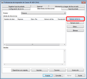 Si utiliza el Canon Generic FAX Driver, haga clic en [Editar libreta de direcciones] en la pestaña [Seleccionar destino] y en [Agregar persona] en [Editar libreta de direcciones] cuando aparezca.