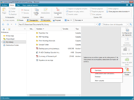 Haga clic en ▼ en el botón de salida de [Carpeta de destino del documento] que aparece en la cinta o en la barra de herramientas y seleccione [Cambiar]