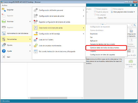 Para crear un botón de salida de [Cambiar datos de índice de documentos] desde Desktop Editor, seleccione el menú [Archivo] > [Configuración/Administración] > [Crear botón para cambiar datos de índice del documento].