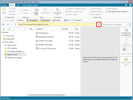 Cuando se introduce una ruta de documento en la barra de direcciones, se muestra la carpeta donde está guardado el documento en la Ventana de navegación. Primero se selecciona el documento en la Ventana de visualización de la lista de archivos y luego se ejecuta la aplicación asociada con el documento y visualiza el documento.