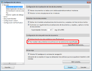 Si no se selecciona [No mostrar vista preliminar de archivos con las extensiones especificadas], la configuración no se habilita aunque se especifiquen las extensiones.