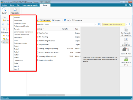 Al hacer clic en [Propied.] en la cinta, se mostrarán los tipos de propiedades que se pueden buscar en la biblioteca seleccionada.