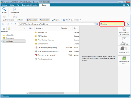 La ruta de acceso a la biblioteca o a la carpeta de objetivo de búsqueda aparece en [Ubicación de búsqueda] en la Pantalla de búsqueda.