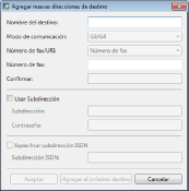 Haga clic para configurar otra dirección de destino. La dirección de destino que introduzca aparecerá en [Dirección del destino], y se mostrará un nuevo cuadro de diálogo [Agregar nuevas direcciones de destino].