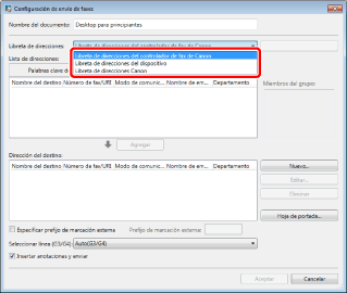 Si selecciona una dirección añadida a [Dirección del destino] y hace clic en [Eliminar], se borra la dirección seleccionada.