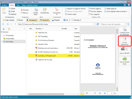 Puede convertir documentos registrados en la biblioteca en documentos PDF y adjuntarlos a un correo electrónico.