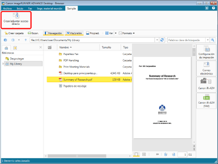 Puede convertir documentos registrados en la biblioteca en documentos PDF y adjuntarlos a un correo electrónico. Para obtener más información, consulte: