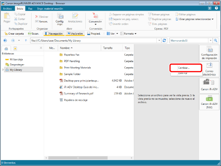 También puede realizar la misma operación haciendo clic en el botón de salida de [Correo electrónico] que aparece en la cinta o en la barra de herramientas y seleccionando [Cambiar]. Si no aparece ningún botón de salida en la cinta o en la barra de herramientas, siga estas indicaciones para mostrar uno.