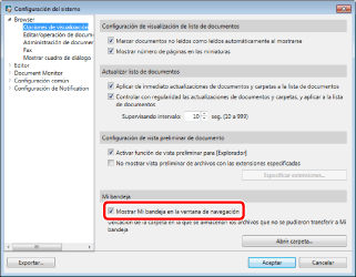 [Configuración del sistema] > [Browser] > [Opciones de visualización] > [Mostrar Mi bandeja en la ventana de navegación]