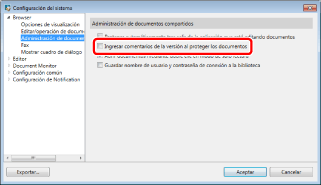 [Configuración del sistema] > [Browser] > [Administración de documentos compartidos] > [Ingresar comentarios de la versión al proteger los documentos]