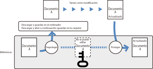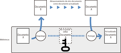 Normalmente, un usuario desprotege un documento en una librería para actualizarlo, y después descarga el documento desprotegido para realizar la operación de edición. Estos procedimientos evitan que otros usuarios realicen otra operación de edición en el mismo documento mientras el usuario original los está editando. Otros usuarios pueden editar el documento sólo después de que el documento sea protegido o se haya cancelado la desprotección.