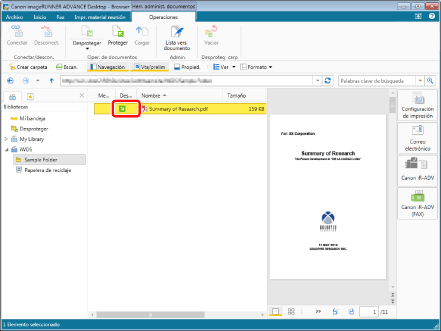 Los elementos de una Biblioteca de Document Server, Biblioteca de SharePoint Server o Biblioteca de Therefore se muestran en la Ventana de visualización de la lista de archivos.
