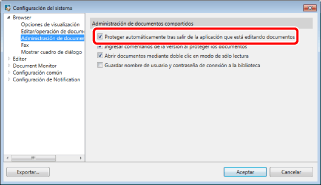 [Configuración del sistema] > [Browser] > [Administración de documentos compartidos] > [Proteger automáticamente tras salir de la aplicación que está editando documentos]