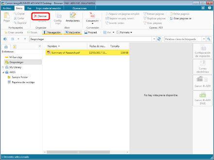 Para eliminar todos los documentos de la carpeta de protección, haga clic en [Vaciar carpeta de desprotección] en la cinta.